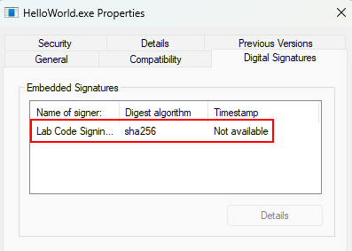 signtool sign /f codesign.pfx /p LabPassword123 /fd SHA256 HelloWorld.exe
