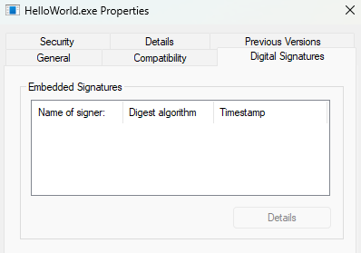 Unsigned application - Digital Signatures tab is empty