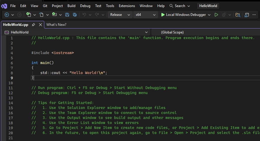 The executable will be at x64\Release\HelloWorld.exe.